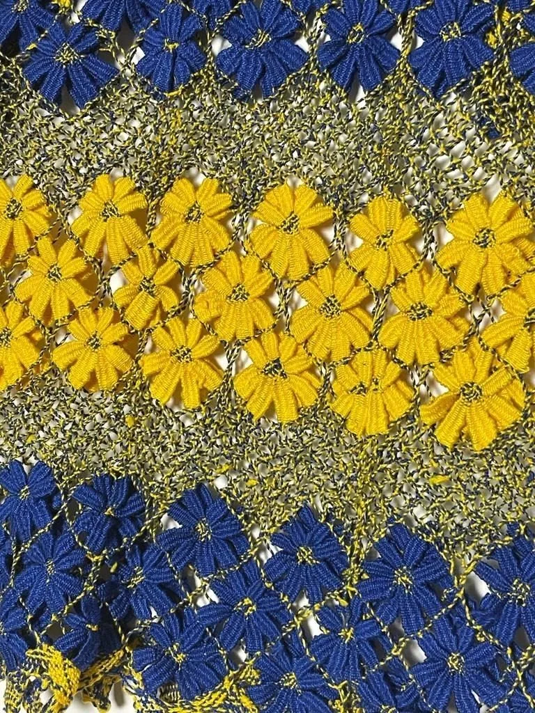 Camiseta de alças em renda de Bilros nas cores de azul royal com amarelo açafrão. Bordado lindíssimo floral 100% artesanal.
