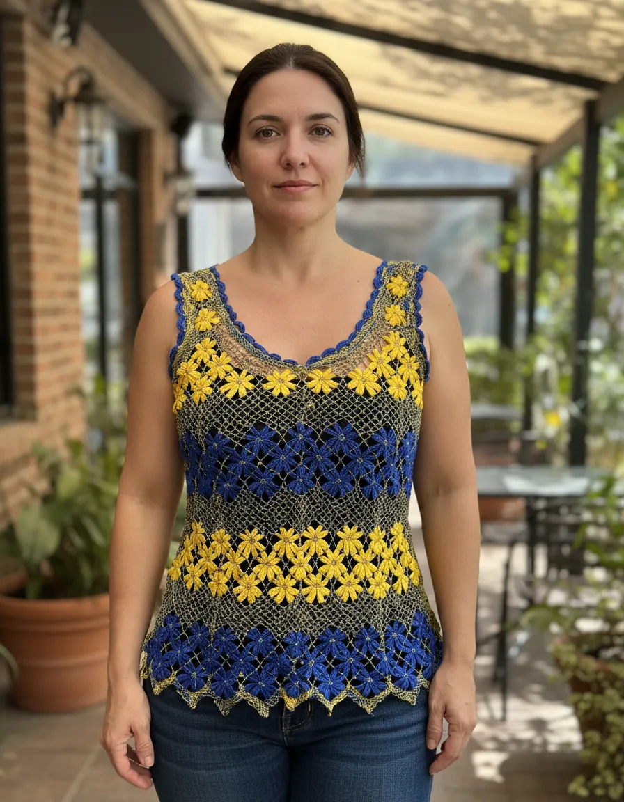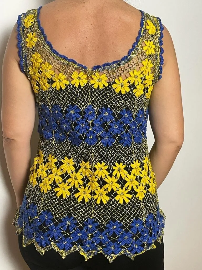 Blusa Regata Renda Artesanal Feminina Azul E Amarelo