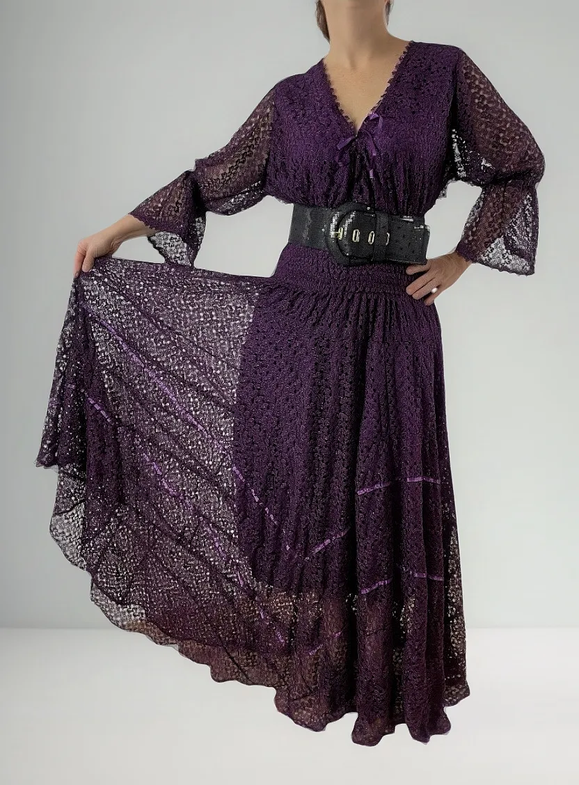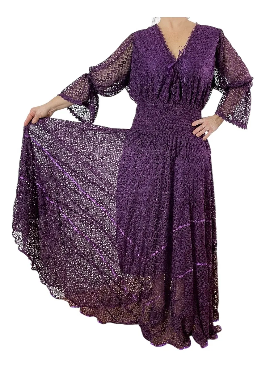 Vestido Longo Violeta Rodado em Renda com Mangas da marca Artesanal Artessan, uma peça que combina elegância e conforto para ocasiões casuais e festas.
