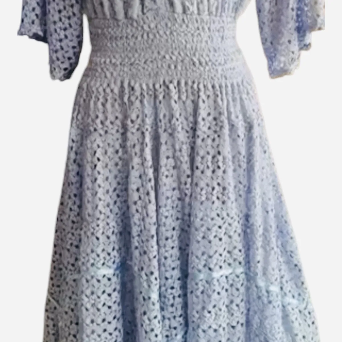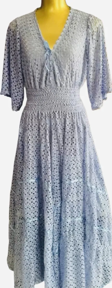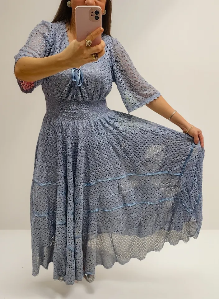 Vestido longo artesanal totalmente em renda na cor lavanda azulado ou azul cobalto que chamo!