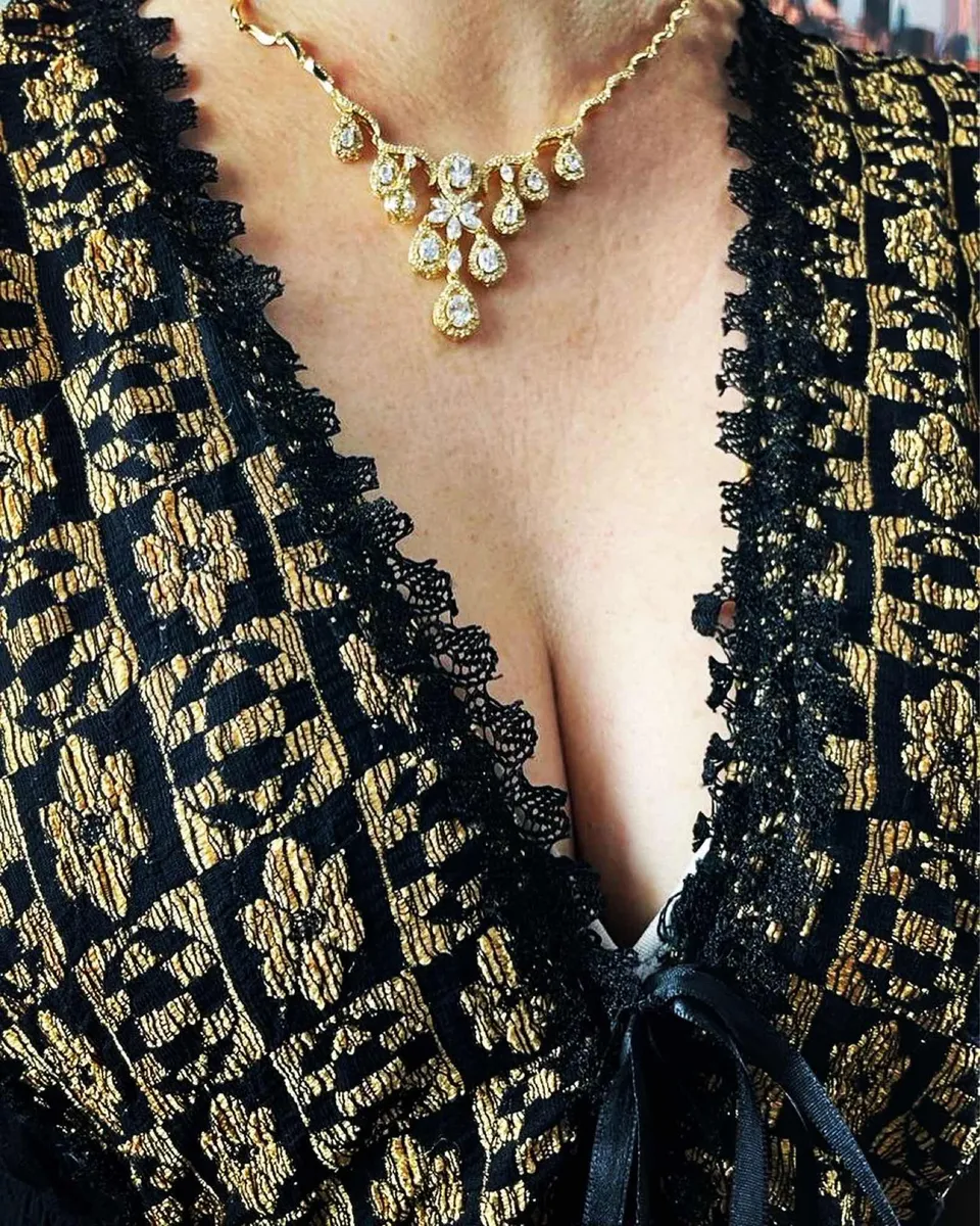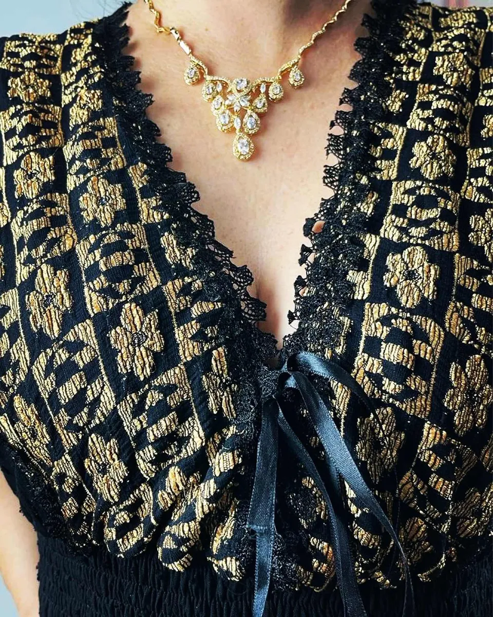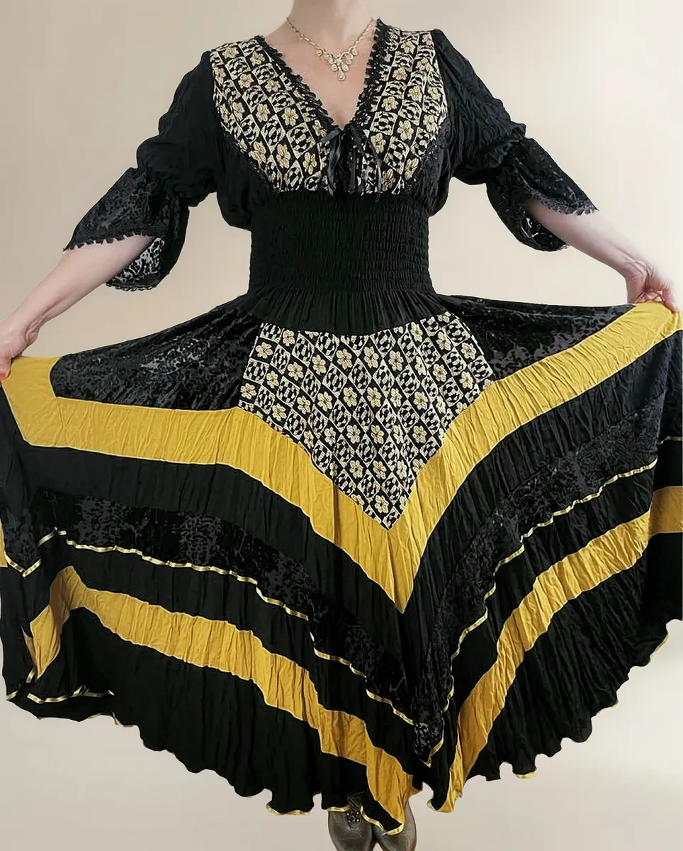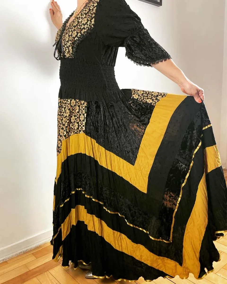 Vestido longo casual ou de festa em algodão peti pois na cor predominante preta num belíssimo degradê com veludo molhado preto e Chiffon na cor amarelo mostarda. . Possui detalhes em renda muito diferenciada e macia de viscose na cor dourada.
