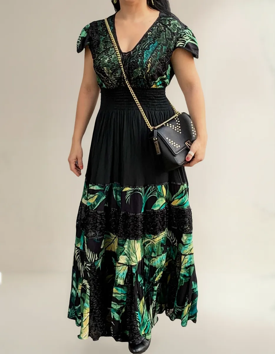 Vestido Longo Preto E Linda Estampa Verde Chiffon Com Renda