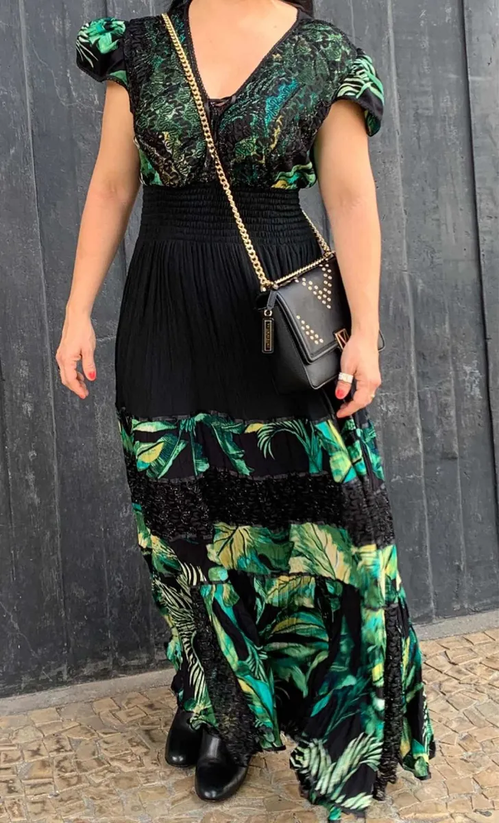 Lindo vestido longo na cor preta com verde esmeralda predominante. Muito tecido Chiffon e bem rodado.