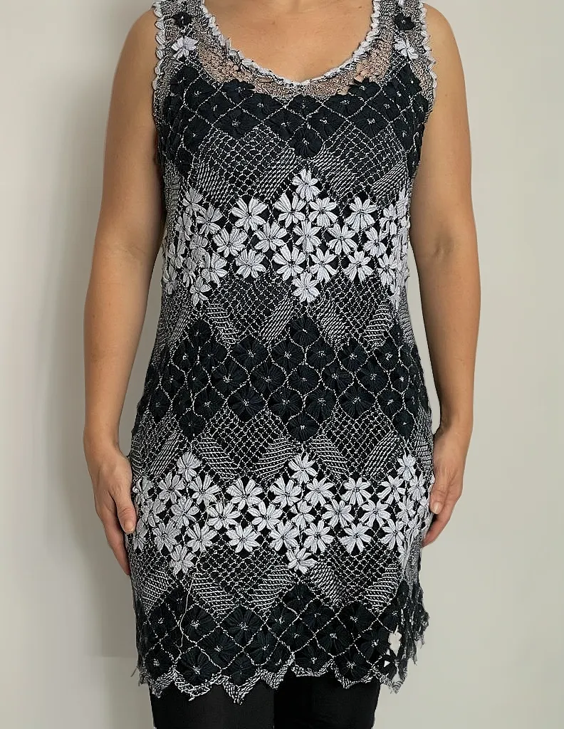 Vestido em renda de Bilros na cor preta com cinza. Lindo bordado floral, totalmente feito a mão na Artessan.